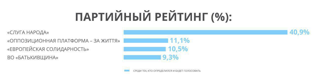 Якби вибори відбулися в ці вихідні, то до Верховної Ради пройшли б чотири політичні сили. За партію Володимира Зеленського «Слуга народу» проголосували б 40,9% виборців, за партію Вадима Рабіновича і Віктора Медведчука «Опозиційна платформа – За життя» – 11,1%, за партію Петра Порошенка «Європейська солідарність» – 10,5%, за партію Юлії Тимошенко «Батьківщина» – 9,3%.