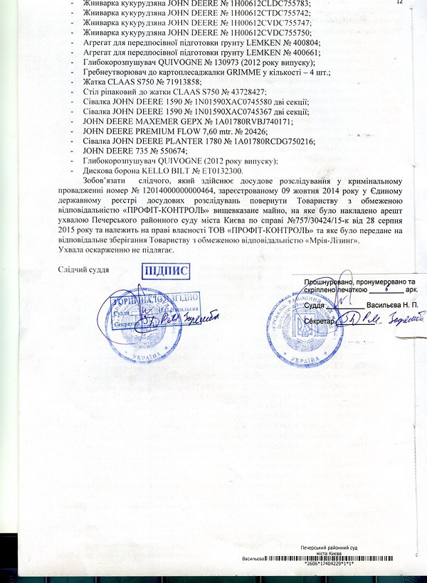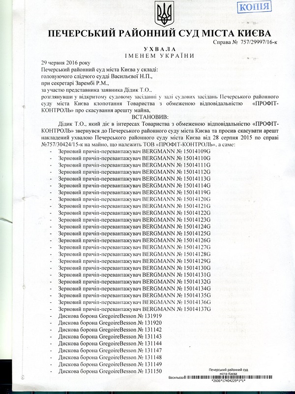 В "Мрії" стверджують, що в жовтні 2014 за вимогою кредиторів, які фінансували покупку цієї техніки, на неї було накладено арешт. Вся ця техніка знаходиться в заставі як забезпечення по кредитах. Незрозуміло, яким чином техніка, яка перебуває під арештом з жовтня 2014 го, була продана влітку 2015-го на адресу компанії ТОВ "Профіт-Контроль". Арешт передбачає заборону на будь-яке відчуження майна, в тому числі продаж, тому продаж цієї техніки незаконний і заперечується в суді.