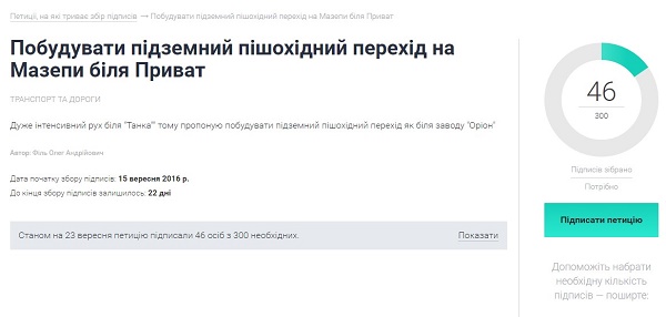 Ще одну електронну петицію зареєстрував тернополянин Олег Філь на сайті міської ради. Цього разу пропонується підтримати ідею облаштування підземного переходу, оскільки рух на вулиці Мазепи доволі інтенсивний: