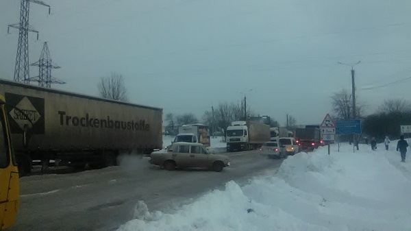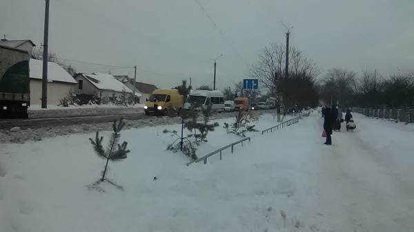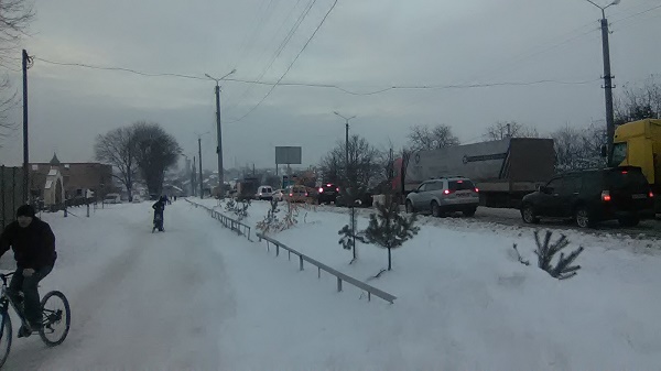 Водій попутки, з яким сьогодні добирались з Теребовлі, і вчора 15 листопада мусів повертатись цією дорогою. Простояв в черзі близько 4 годин. Правда потрапив він в затор вже біля повороту на кемпінг. Сьогодні нам "пощастило" більше і автівка вперлася в дорожній корок навпроти ресторану "Пролісок". Разом з іншими бідолахами в чергу пристроївся і невеликий тракторець з лопатою для згрібання снігу. Водій явно нікуди не спішив і чемно сунув дефіцитну техніку в загальній колоні...