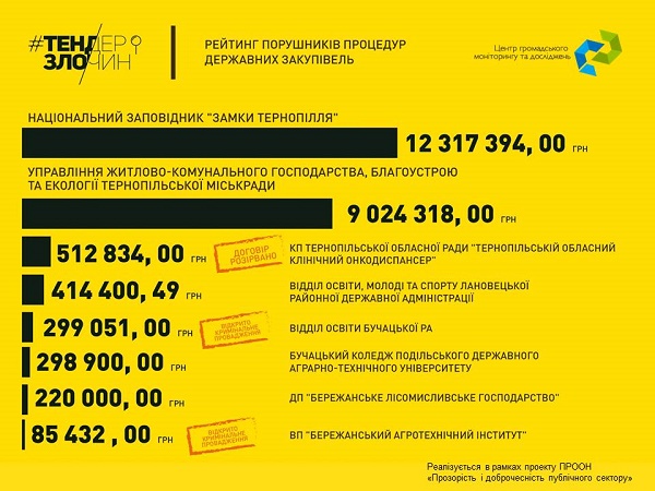 Аналіз процедур державних закупівель в Тернопільській області провели експерти «Центру громадського моніторингу та досліджень». На основі проведеної роботи вони склали рейтинг порушників.