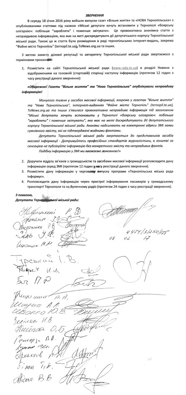 На сайті Тернопільської ради служба зв’язків з громадськістю опублікувала звернення кількох депутатів міської ради про те, що їхню роботу та ініціативи на користь громади невірно трактують та перекручують журналісти кількох видань в Тернополі.