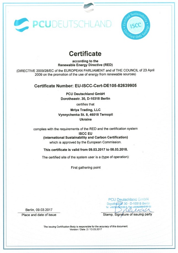 *ISCC – це визнана Європейською комісією добровільна система сертифікації, розроблена відповідно до вимог та на виконання Директиви 2009/28/ЕС Європейського Парламенту та Ради Європи від 23 квітня 2009 року стосовно сприяння використанню енергії з відновлюваних джерел, метою якої є збільшення долі використання біопалива та зменшення викидів парникових газів в атмосферу, забезпечення екологічно відповідального та сталого виробництва.