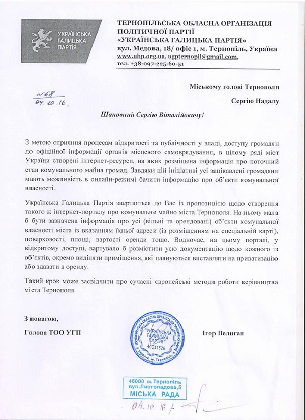 Керівництво Тернопільської обласної організації Української Галицької Партії звернулись листом до керівництва міста Тернополя стосовно комунальної власності. Відповідна інформація поширена на сторінці партії в соціальних мережах.