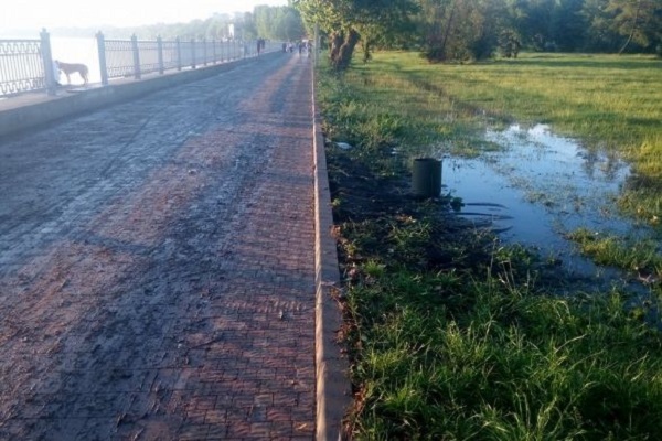 Через відсутність стоків для води на відремонтованій набережній утворюються калюжі, а газони стоять у воді. Про це пишуть у соцмережах тернополяни.