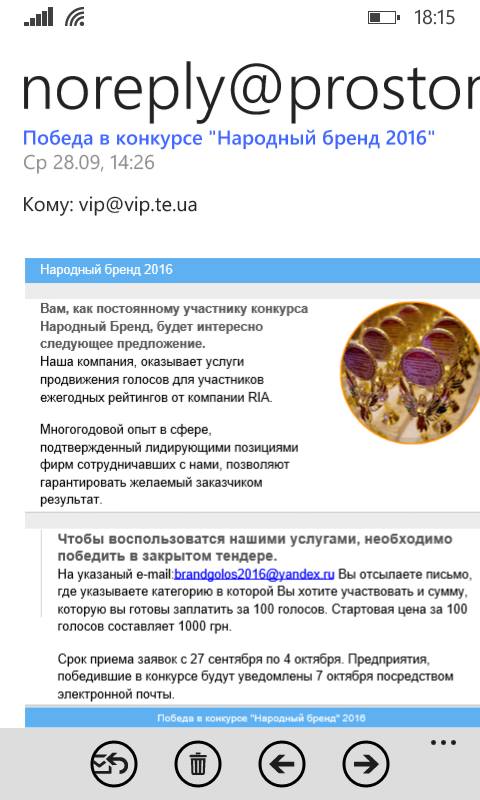 На електронні адреси підприємців, які брали або потенційно можуть взяти участь у щорічному конкурсі від тернопільської газети «РІА» –«Народний бренд», надходять повідомлення, в яких сповіщається, що певну кількість голосів для перемоги можна «накрутити».